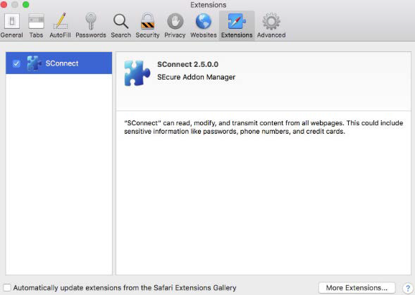 Click the Extentions tab and then select the SConnect check box in the left pane.